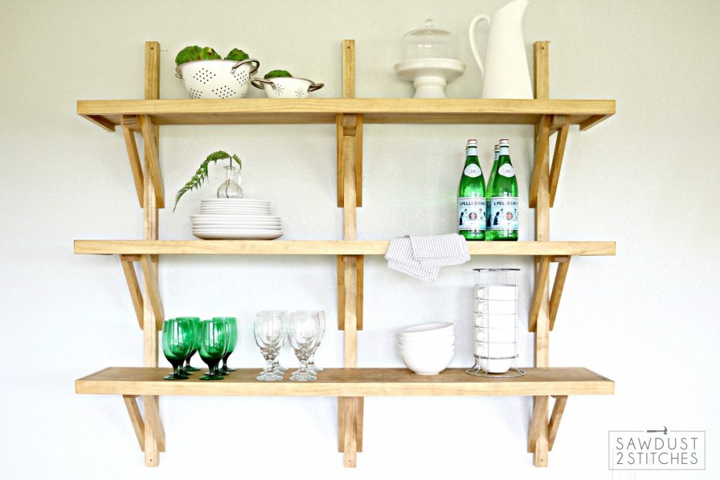 For a modern take on farmhouse style, try this open shelving option that will look gorgeous supporting your kitchen dinnerware or home decor.