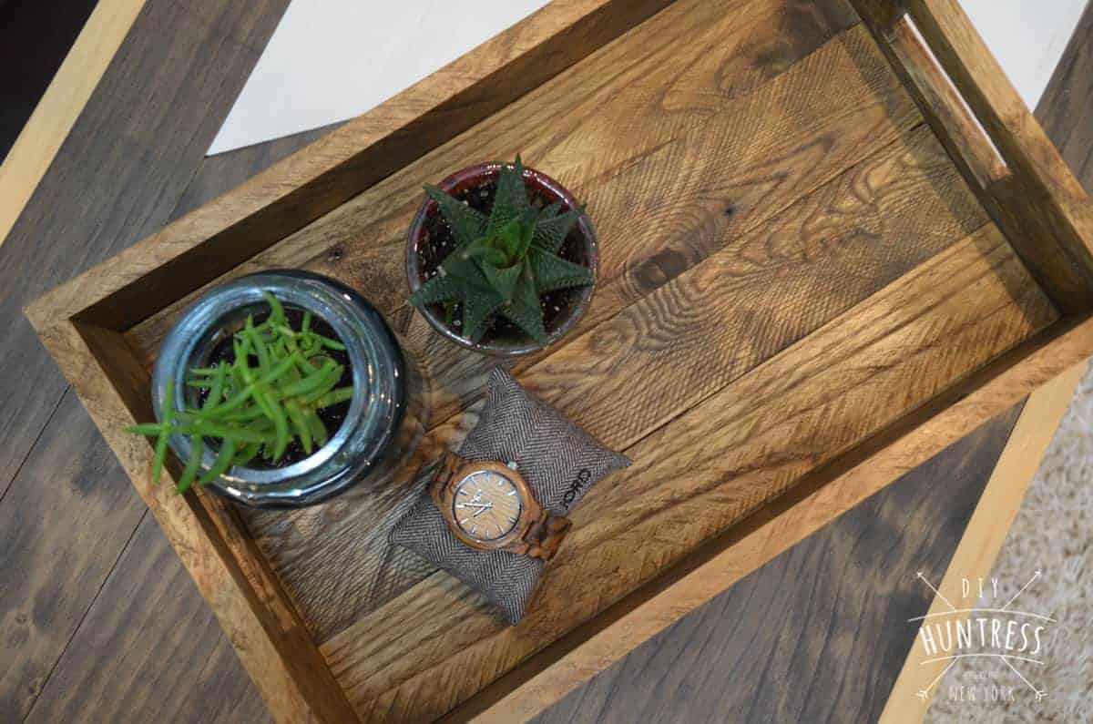 For the cost of nails, stain, pallet wood, and Rapid Fuse All Purpose, you can create a knock off wood tray. DIY Huntress walked us through how she created a beautiful wood tray for her home.