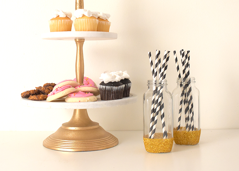 The holidays are upon us! If you are looking for some last minute decorations to add a festive flair to your Christmas party or to help ring in the New Year, then try this easy technique to embellish any glass item with glitter.